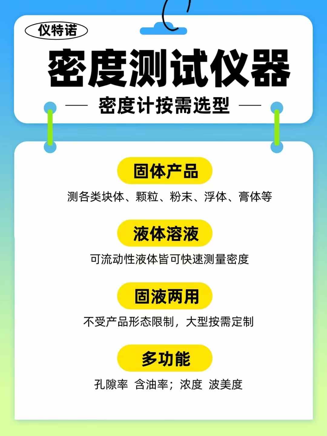 無論是兩步測固體,還是一步測液體,儀特諾都讓密度測試變得簡單直觀。作為專業的密度計生產廠家,我們始終秉持一個使命:讓密度測試變得更簡單、更智能!