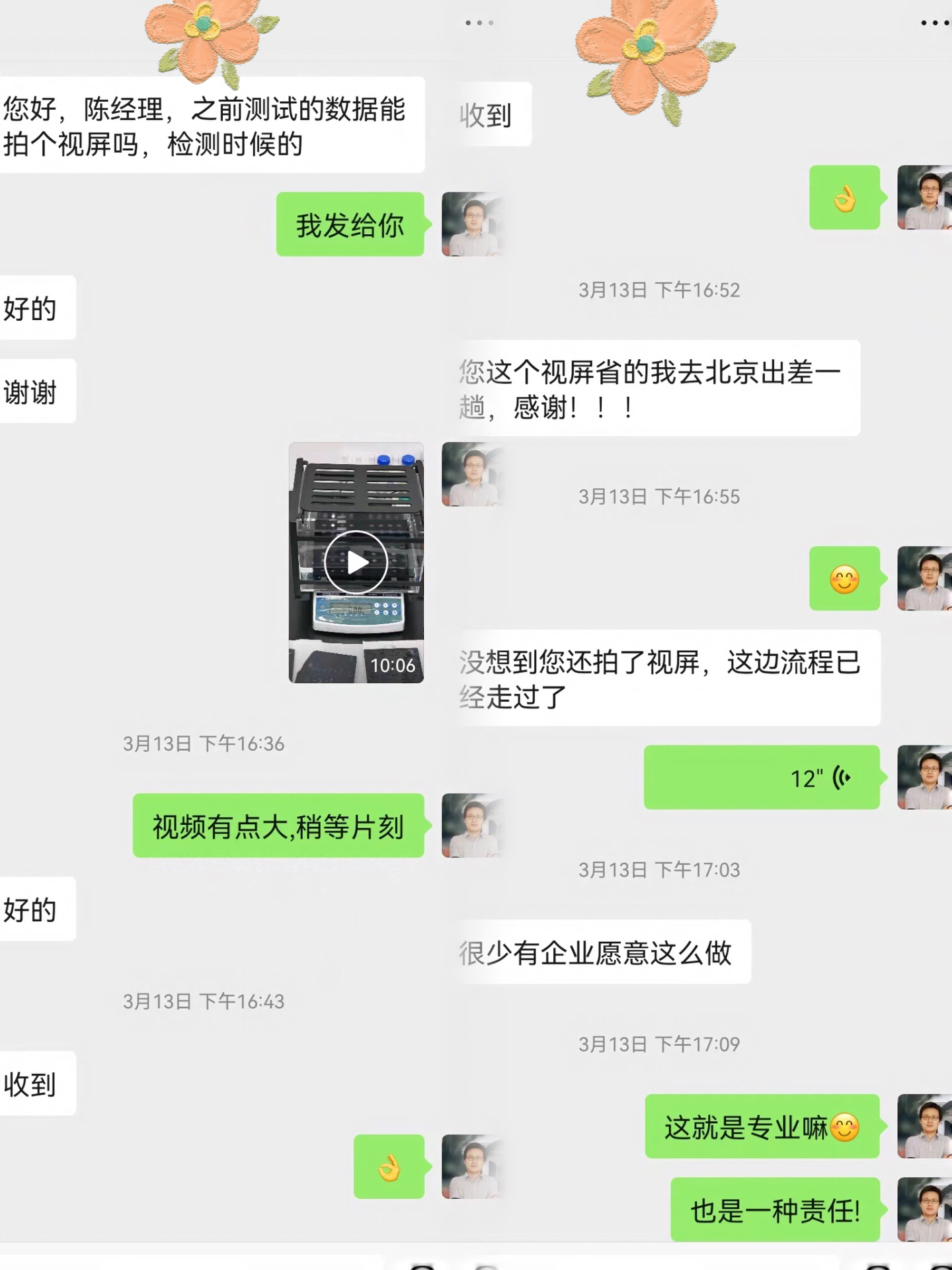 他沒想到我們會主動拍樣品測試視頻,在用戶的想法里是很少有企業會這么做的,而我們收到客戶樣品拍測量視頻,只是一個常規操作,順手而為的事情。