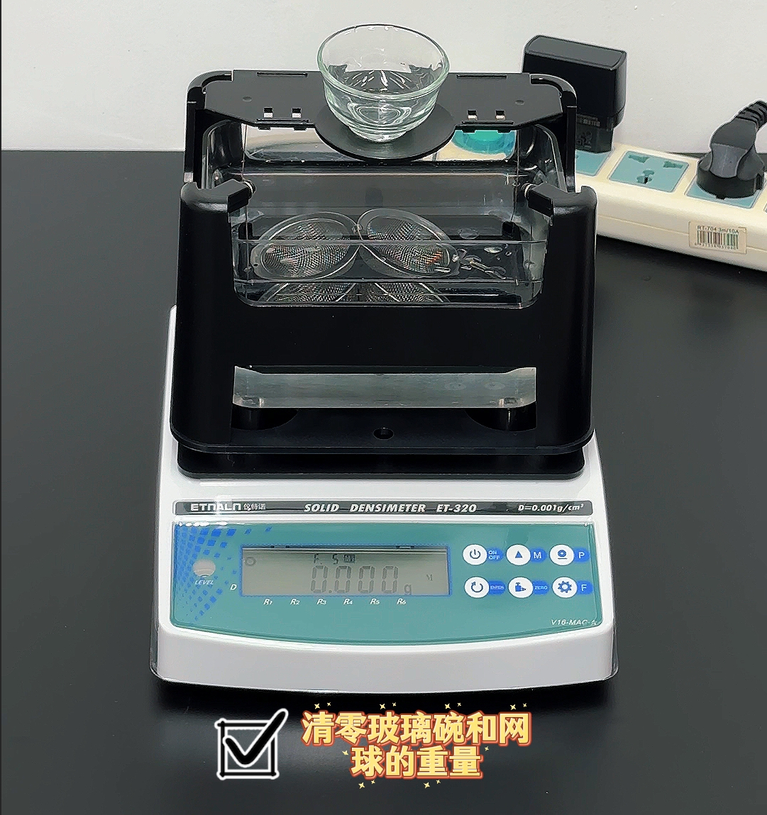 因為單個顆粒太輕,我們沒法只取一顆來測試,所以需要配套使用玻璃碗和網球(儀器標準配置里都有含有測顆粒的配件、測浮體配件)。